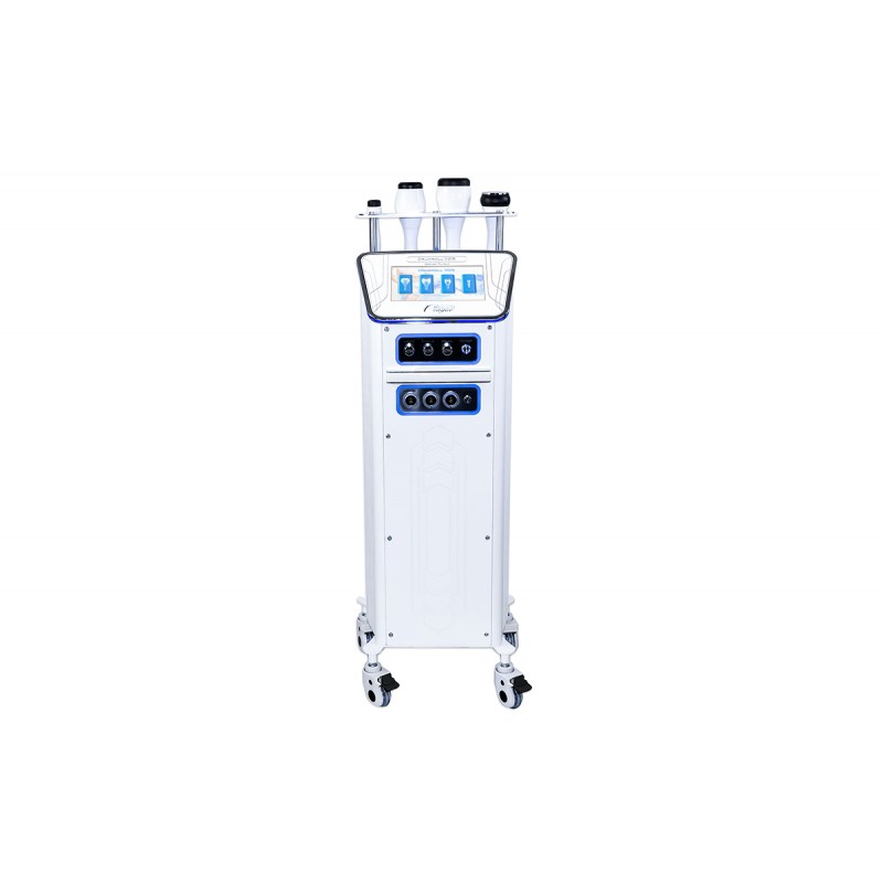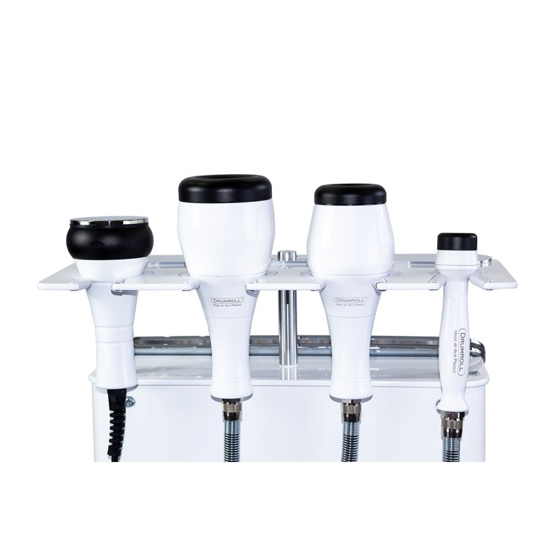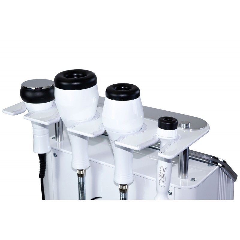 Equipped with handpieces of varying diameters, the machine targets localized and extensive problem areas. Upon contact with the skin, the machine works in four simultaneous directions: