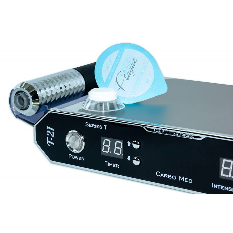 The T-21 employs a patented handpiece design to deliver CO2 transdermally. A chemical reaction between Carbomed capsules and treatment gel generates carbon dioxide, which penetrates the skin without causing injury or discomfort. This innovative process triggers the Bohr effect, enhancing oxygen delivery and activating natural skin renewal mechanisms.